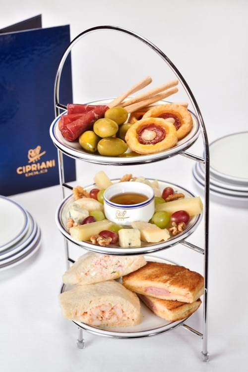 A three-tiered tower with Valtellina, Vegetarian, and Bufalina Pizza