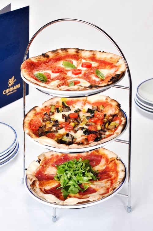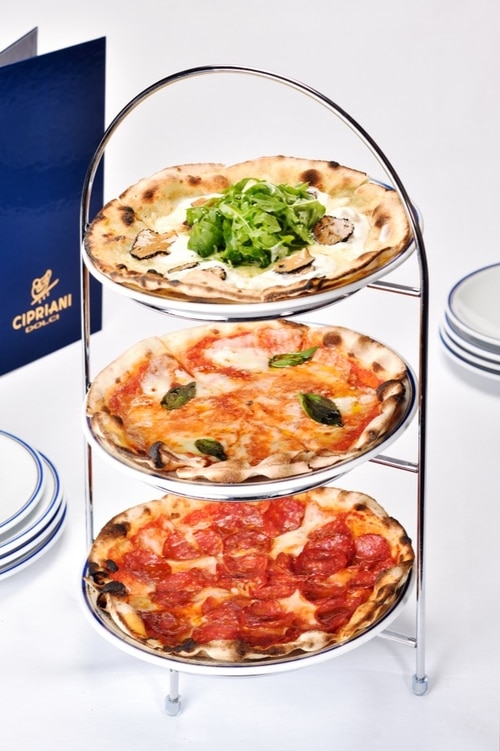 A three-tiered tower with Black Truffle Pizza, Margherita, Peperoni Pizza